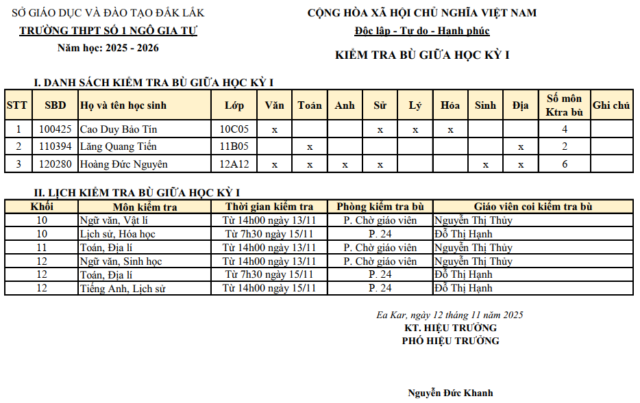 Trang chủ Kiểm tra tập trung Danh sách học sinh kiểm tra bù giữa học kỳ I năm...Tin tức - Kế hoạchKiểm tra tập trungTin nhà trườngDanh sách học sinh kiểm tra bù giữa học kỳ I năm học 2025-2026Bởi THPT số 1 Ngô Gia Tự - 13/11/202526 Danh sách kiểm tra bù Sơ đồ phòng Danh sách kiểm tra bù Sơ đồ phòng