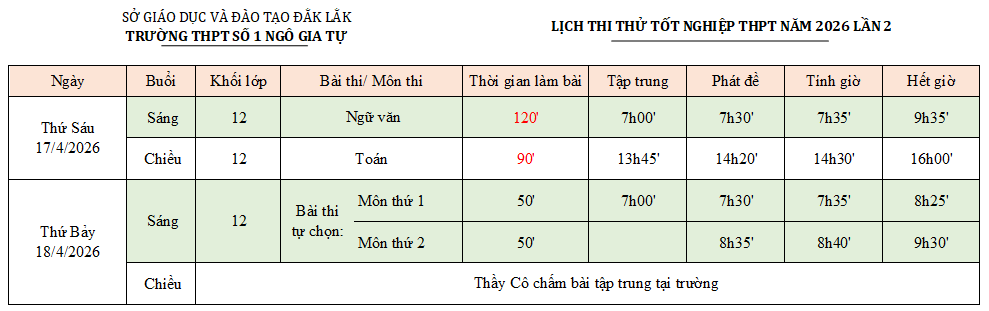Trang chủ Kiểm tra tập trung DSHS dự thi, DSGV coi thi thử tốt nghiệp THPT năm 2026...Tin tức - Kế hoạchKiểm tra tập trungNổi bậtTin nhà trườngDSHS dự thi, DSGV coi thi thử tốt nghiệp THPT năm 2026 lần 2Bởi THPT số 1 Ngô Gia Tự - 14/04/202647Lịch thiDSHS dự thiDSGV coi thiSơ đồ phòng Lịch thi DSHS dự thi Tải về file này: (DSHS-THI-THU-LAN-2-THEO-SBD-PHONG-THI-MON-THI.pdf, 580KB) DSGV coi thi Tải về file này: (DSGV-COI-THI-THU-L2-2526.pdf, 229KB) Sơ đồ phòng