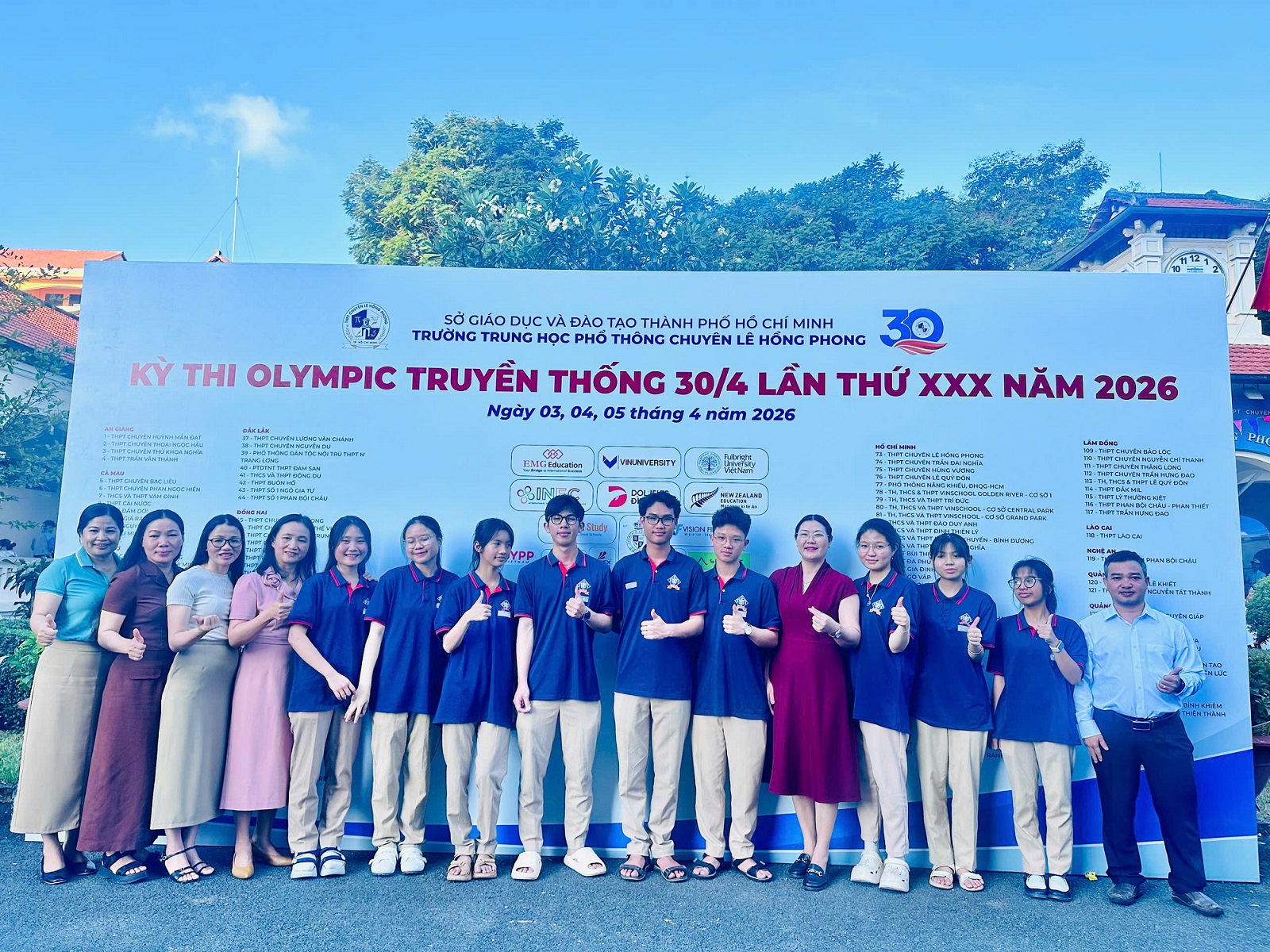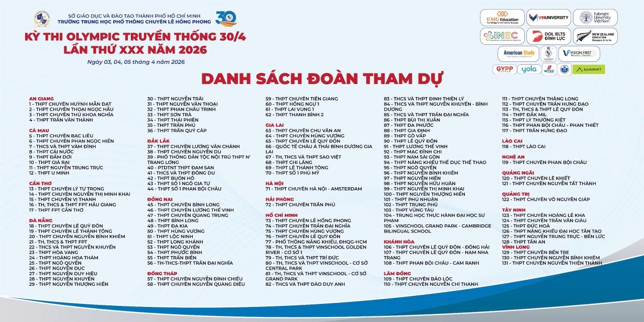 * Kỳ thi Olympic truyền thống 30/4 lần thứ XXX năm 2026, được tổ chức tại Trường THPT chuyên Lê Hồng Phong, Thành phố Hồ Chí Minh từ ngày 03-05/4/2026 với 131 đoàn tham gia, 3839 thí sinh dự thi.