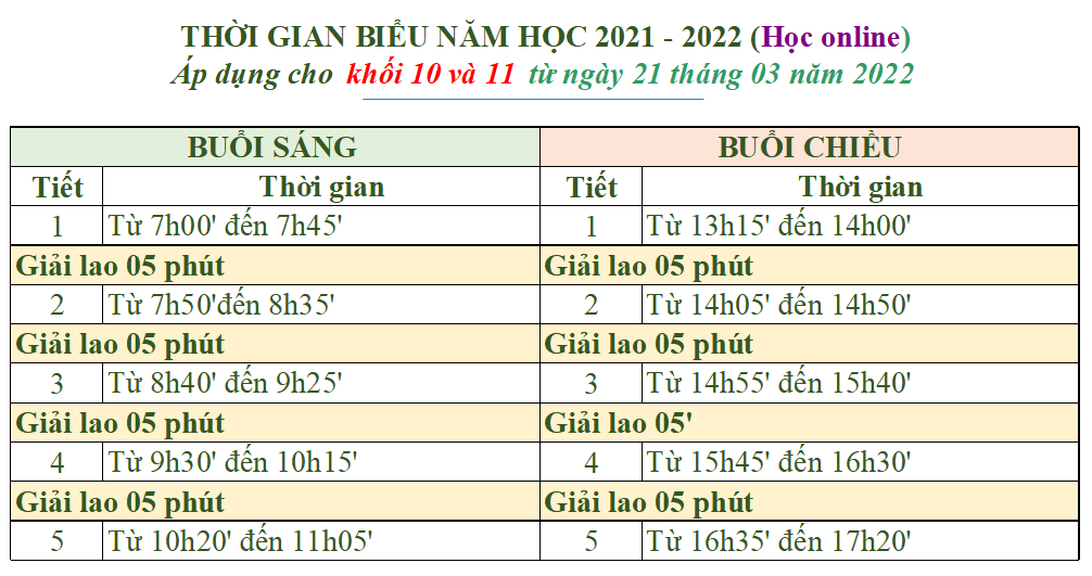 Thời khóa biểu lần thứ 13 thực hiện từ ngày 21/03/2022, năm học 2021-2022