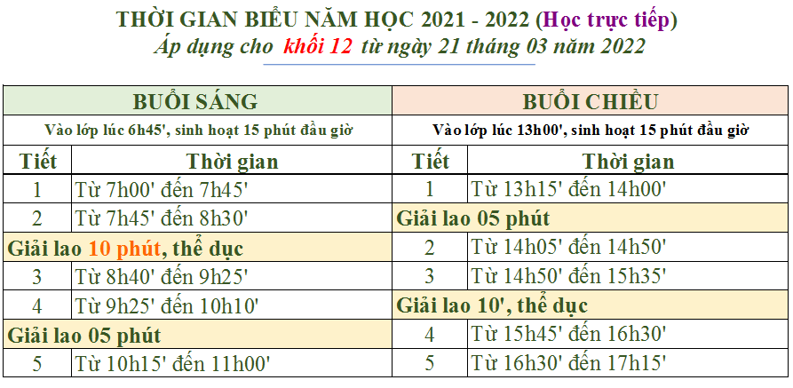 Thời gian biểu dành cho Khối 12 – Học trực tiếp tại trường: